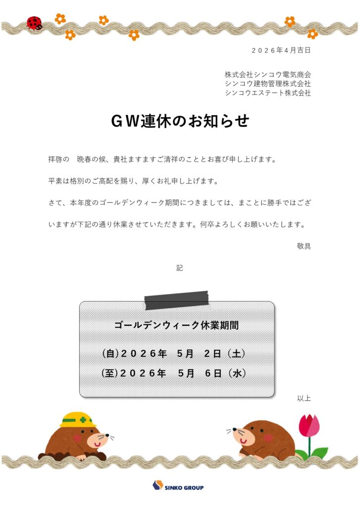 ゴールデンウイーク期間中、弊社は下記のとおり休業させていただきます。